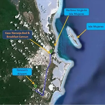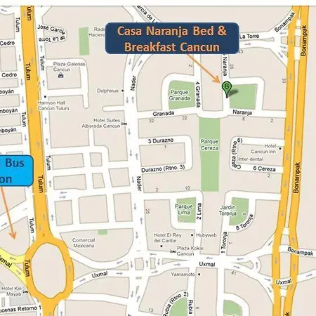 L'hotel se trouve dans le quartier Centre-ville de Cancún, à 20 minutes à pied de sites religieux tels que la Église de Cristo Rey. Le Stade Technologique est situé à 3 km de l'hotel, ainsi que l'aéroport National d'Isla Mujeres est à 10 km. Pour les amateurs de sport Bed & Breakfast La Casa Naranja de Cancún se trouve à proximité de l'Estadio Beto Ávila à 10 minutes en voiture. Cet hotel est situé non loin de l'arrêt de bus R4 r5 R6.